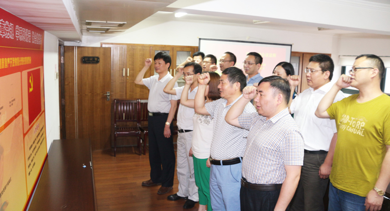 7月1日,华鑫支部书记梅声涛组织支部学习党章,重要讲话,党员同志们在党旗下,重温入党誓词。