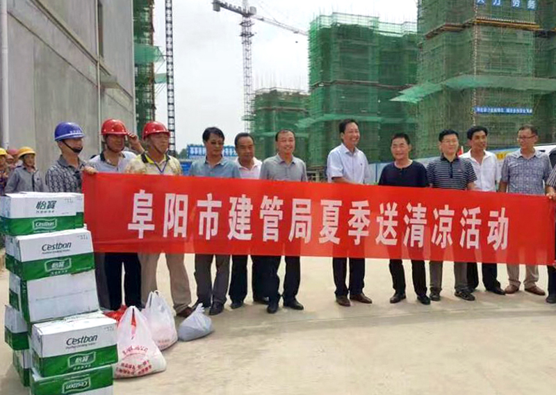 2016年8月10日上午,阜阳市建筑业监督管理局马西荣局长,在副局长钮扣、薛杨及颍东区建管分局薛东广局长陪同下,来到华力建设承建的颍河水岸三期工程施工现场,对施工现场作业工人进行了亲切的慰问,送去精心挑选的防暑降温物品,也传递着阜阳住建委和市建管局的真情关怀。华力建设常务副总经理赵学军陪同参加了慰问活动。
