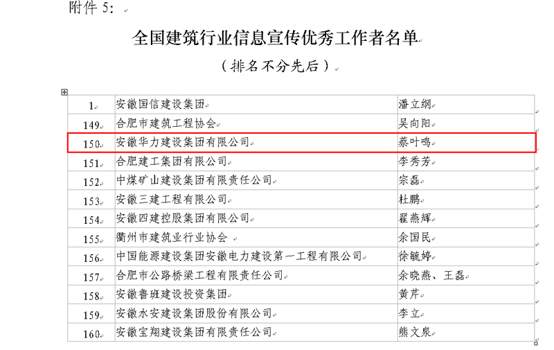7月20日,全国建筑行业信息传媒工作经验交流会在宁夏银川举行,华力建设集团凭借旗下网站、微信公众号“安徽华力建设集团”和期刊《今日华力》,一举囊括全国建筑行业精品网站、精品微信公众号、优秀期刊三项荣誉,获得业界一致好评,同时,蔡叶鸣荣获全国建筑行业信息宣传优秀工作者称号。