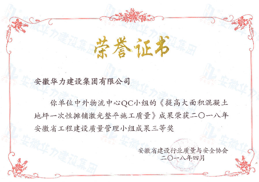 “明珠路西延工程”QC小组“提高高架桥钢筋砼防撞护栏的外观质量”成果,在中国市政工程协会举办的2018年度全国市政工程建设优秀QC小组活动成果发布会上,荣获“全国市政工程建设先进质量管理小组”称号;“提高钢筋砼防撞护栏的外观质量”成果获得“国家级市政优秀奖”;已建成投用的合肥168中学体育馆,现作为安徽省首例采用隔震技术的项目,应用的“提高钢筋砼防撞护栏的外观质量”成果荣获“国家级市政优秀奖”;“合肥智能装备科技园”QC小组“提高塔式起重机使用过程的安全性”成果、“悬挑式脚手架搭设的质量控制”成果,“中外物流中心项目”QC小组“提高大面积混凝土地坪一次性摊铺”成果分别斩获市级一、二、三等奖。