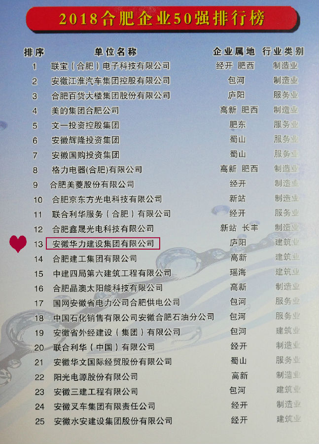 这是安徽华力建设集团有限公司继2017年之后,再次荣登“合肥建筑业企业20强”榜首;荣登“合肥企业50强”榜单第13位,较2017年上升一个位次。