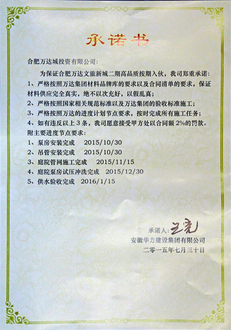 华力建设承建了合肥万达城二期住宅市政给水管网及地下室泵房安装工程、主题乐园雨污水管网工程、合肥万达茂、超高层公寓雨污水管网工程。作为施工单位之一,华力建设决心要把工程做好做精,一方面,学习万达雷厉风行、严格管理的精神,另一方面,希望与万达有进一步的深度合作。