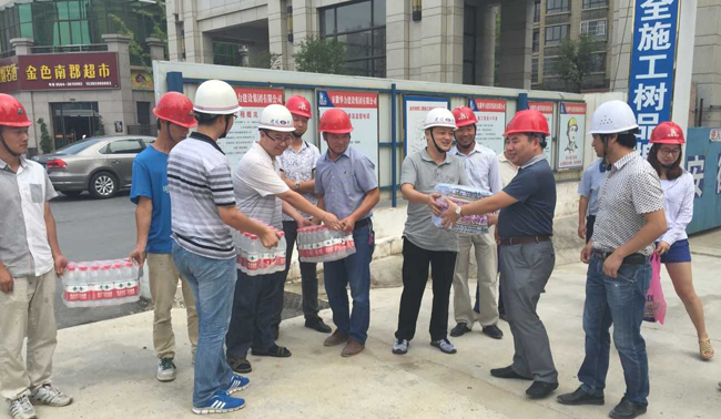 周主任、刘主任仔细询问了一线工人工作、生活情况,给他们送上毛巾、矿泉水、清凉油等防暑降温用品,并亲切叮嘱项目负责人在抓质量、重安全的同时要注意防暑降温,合理安排工作时间,避开高温时段;要根据夏季高温气候特点及时调整作息时间,认真落实防暑降温措施,充分保证工人的休息,防止中暑,确保施工安全。项目负责人李明、金色南郡各参建单位均纷纷表态,将进一步认真贯彻落实市、区两级建设部门领导对项目现场的安全生产要求,确保施工安全。
