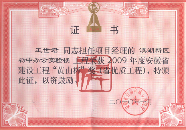 王世君从事建设行业20多年,从公司成立之初,就一直从事项目管理工作,从测量员到技术员到项目经理,一步一个坚实的脚印,走出了自己人生的华丽篇章,是跟随华力一起成长的典范。他始终秉承“老老实实做人、踏踏实实做事”理念,践行“干一个工程,树一座丰碑”的思想,多年来所承接的工程都是都是达到优良标准。特别是他所承建的合肥燃气集团综合服务楼工程获2011年11月荣获全国优质工程鲁班奖;新桥机场综合办公楼工程荣获2013年度安徽省优质工程“黄山杯”;滨湖新区初中艺术综合楼荣获2010年度安徽省优质工程“黄山杯”;滨湖新区办公实验楼工程荣获2010年度安徽省优质工程“黄山杯”......