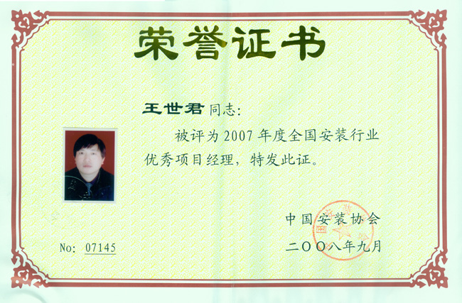 由于王世君的工程业绩突出,他被评为2007年安装行业优秀项目经理,2008年度全国建筑业优秀项目经理,2011年度“鲁班奖”工程项目经理,2011年度全国建筑业优秀项目经理。这次又被评上建造师最高奖“茅以升科学技术奖——建造师奖”,实属名至实归。