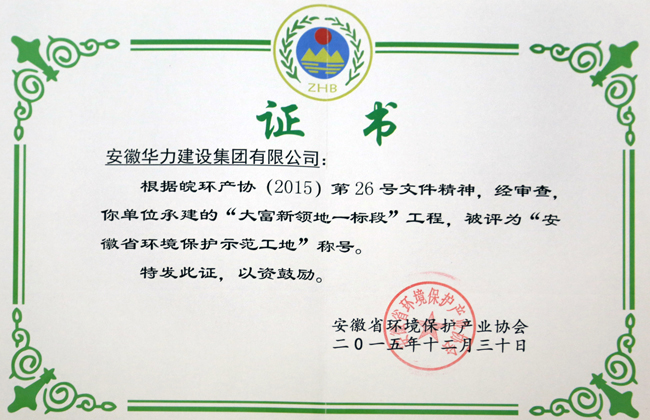 近日,从安徽省环境保护产业协会获悉,华力建设施工的大富新领地一标段工程项目部,积极开展的“建设生态安徽,创建绿色家园”环保活动,严格按照国家和地方环保法规要求,积极落实节能减排措施,环保工作成效显著,喜获2015年度安徽省“环境保护优秀示范工地”称号。