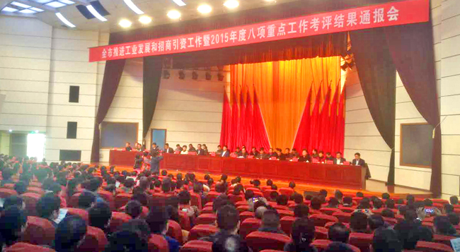 市领导孙云飞、毕小彬、王胜、李乔、潘东旭、付新安、杨光祥、王琦、何颖、陈家本、束学龙、孟永勇、张日升等出席会议。省经信委主任牛弩韬应邀参加会议并作了专题报告,市委书记、市人大常委会主任孙云飞作了重要讲话,市长毕小彬主持会议并就抓好会议精神落实提出要求。会上,市委常委,常务副市长付新安宣读了市委、市政府关于2015年度全市招商引资等8项重点工作考评结果的通报。