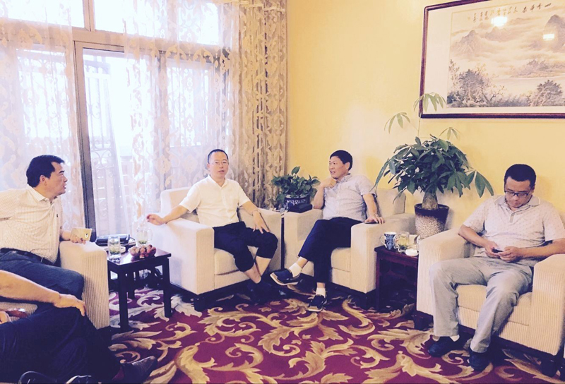 常前仓董事长(右二)、刘进副董事长(左一)同何竞学局长(左二)等交谈中