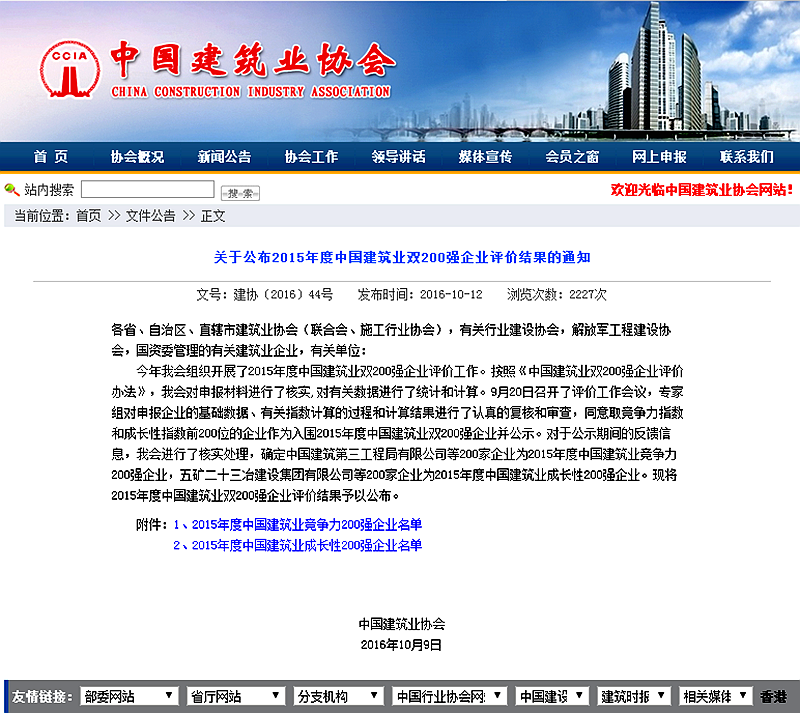 10月12日,中国建筑业协会公布了《关于公布2015年度中国建筑业双200强企业评价结果的通知》,华力建设在“2015年度中国建筑业竞争力200强企业”中,榜上有名,位列160位。此前,他们已经连续六年获“中国建筑业成长性百强企业”,此次“晋升”是华力人在新常态下,不断进取,不断进步的良好体现,华力的实力得到了广泛的认同。