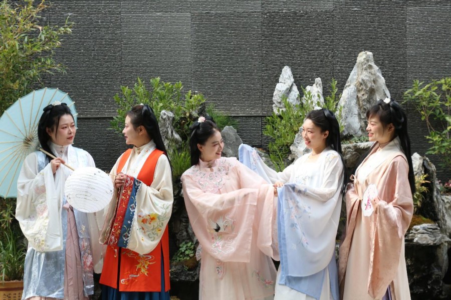 上午8点,汉服摄影环节开始。只见平时干练飒爽的女员工们,此刻个个略施粉黛,身着汉服,楚楚动人,在精美的背景墙或华力国际交流中心的流水景观前留下倩影。