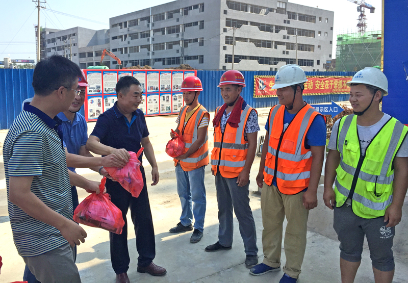 7月29日上午,烈日当空,骄阳似火,炎夏送清凉,点滴润人心。合肥市经开区党工委副书记、空港办主任桑林兵,在经开区重点工程建设管理局副局长王朝阳和北区房建部人员的陪同下,冒着酷暑来到安徽华力承建的长岗小学、空港启动区及水源保护区安置点工程,向工人们送去矿泉水、防暑降温药品和防护品,开展夏季送清凉活动,让广大一线工人们在炎炎夏日感受到了深深凉意。