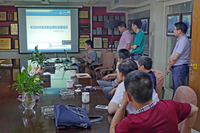 常前仓董事长向客人介绍了华力集团目前的经营发展状况,华力依托科技创新,加快转型升级,成立BIM技术研发中心和PPP事业部,建立新的工程管理运营模式。并以现场演示和在建项目为例,详细介绍了BIM技术在工程施工中的具体应用,以及目前华力集团住宅产业化的发展情况。