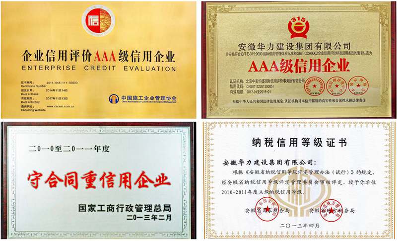 安徽华力建设集团有限公司与安徽省天昕市政工程有限公司荣获首批“安徽省信用企业”;华力集团先后被评为“全国守合同重信用企业”、“银行授信AAA级企业”、“安徽省纳税信誉级单位”、“全国建筑业AAA级信用企业”。