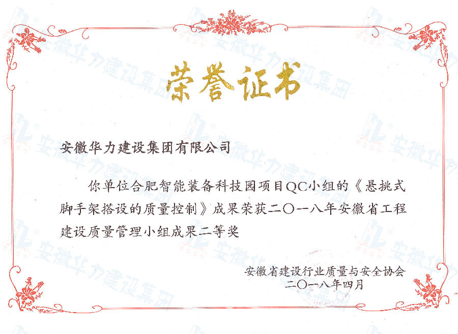 “明珠路西延工程”QC小组“提高高架桥钢筋砼防撞护栏的外观质量”成果,在中国市政工程协会举办的2018年度全国市政工程建设优秀QC小组活动成果发布会上,荣获“全国市政工程建设先进质量管理小组”称号;“提高钢筋砼防撞护栏的外观质量”成果获得“国家级市政优秀奖”;已建成投用的合肥168中学体育馆,现作为安徽省首例采用隔震技术的项目,应用的“提高钢筋砼防撞护栏的外观质量”成果荣获“国家级市政优秀奖”;“合肥智能装备科技园”QC小组“提高塔式起重机使用过程的安全性”成果、“悬挑式脚手架搭设的质量控制”成果,“中外物流中心项目”QC小组“提高大面积混凝土地坪一次性摊铺”成果分别斩获市级一、二、三等奖。